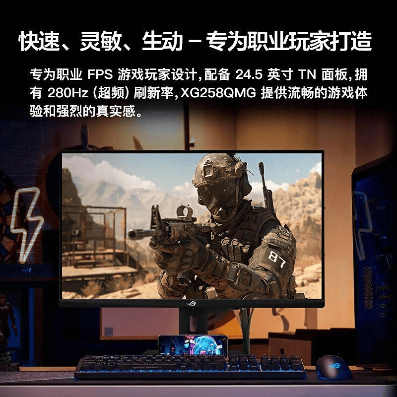 华硕ROG XG258QMG绝杀25电竞游戏显示器专为追求极致游戏体验的玩家打造。24.5英寸的屏幕提供了广阔的视野,240Hz的刷新率让游戏画面流畅无比,确保玩家在激烈的对战中抢占先机。