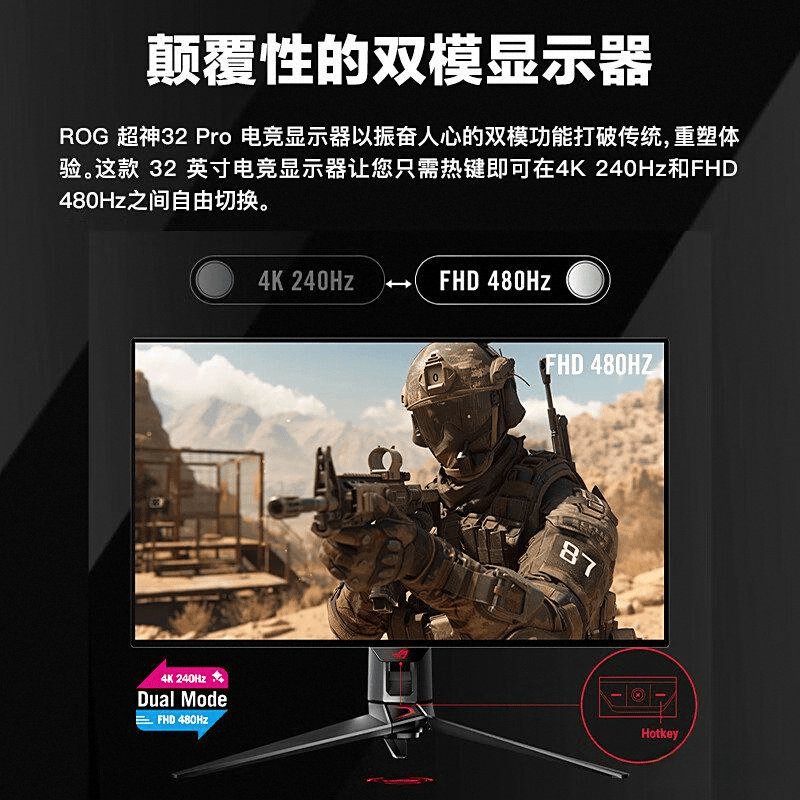 支持双模显示,1K分辨率下刷新率高达480Hz,为玩家提供了更多选择。HDR400的加持提升了画面的动态范围,让暗部细节与高光表现更加出色。