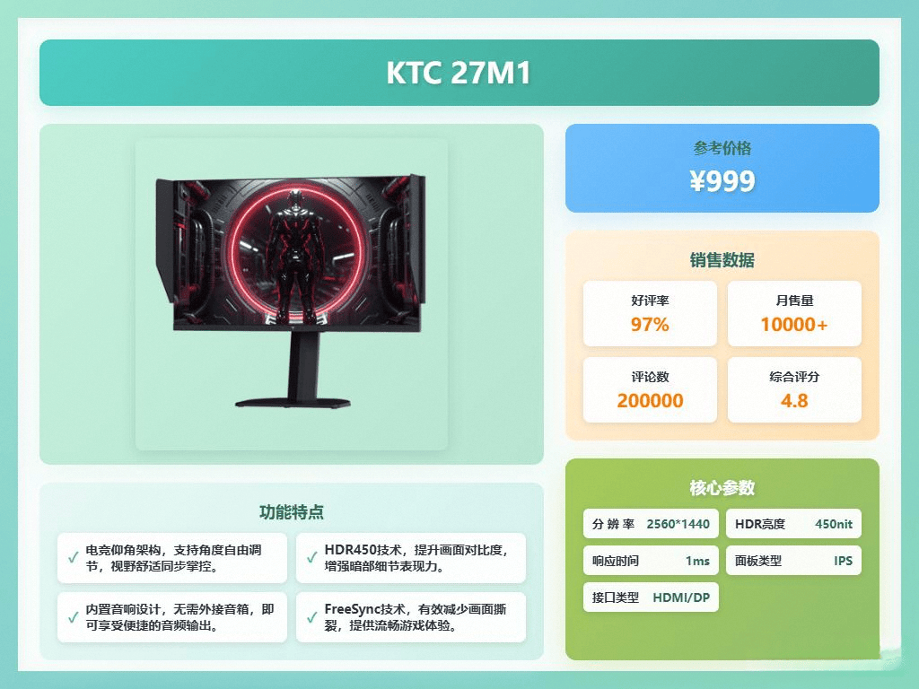 KTC的这款27英寸显示器,使用体验非常出色!2K分辨率搭配IPS面板,画面细腻,色彩也非常准确,无论是看电影还是修图,细节都清晰可见。原生200Hz刷新率加上1ms响应,玩游戏时非常流畅,再也不用担心画面拖影了。加上FreeSync技术,告别画面撕裂,游戏体验更上一层楼。