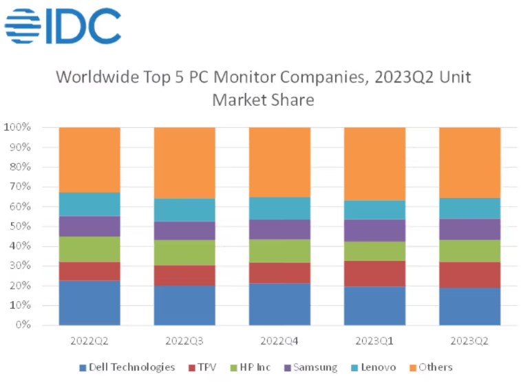 值得一提的是,戴尔、TPV、惠普、三星、联想仍然是 2023 年 Q2 显现器商场占比前五。