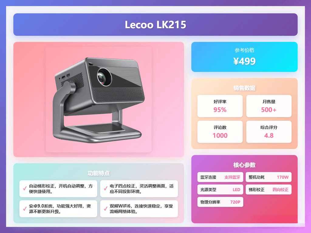 LK215的自动梯形矫正功能十分贴心,无需手动调节,开机后即可自动完成画面校正,让使用变得简单省事。配合全自动对焦系统,确保每次投影都能获得清晰、方正的画面,减少繁琐操作。这样一来,无论在不同空间或角度,都能轻松获得理想的投影效果。
